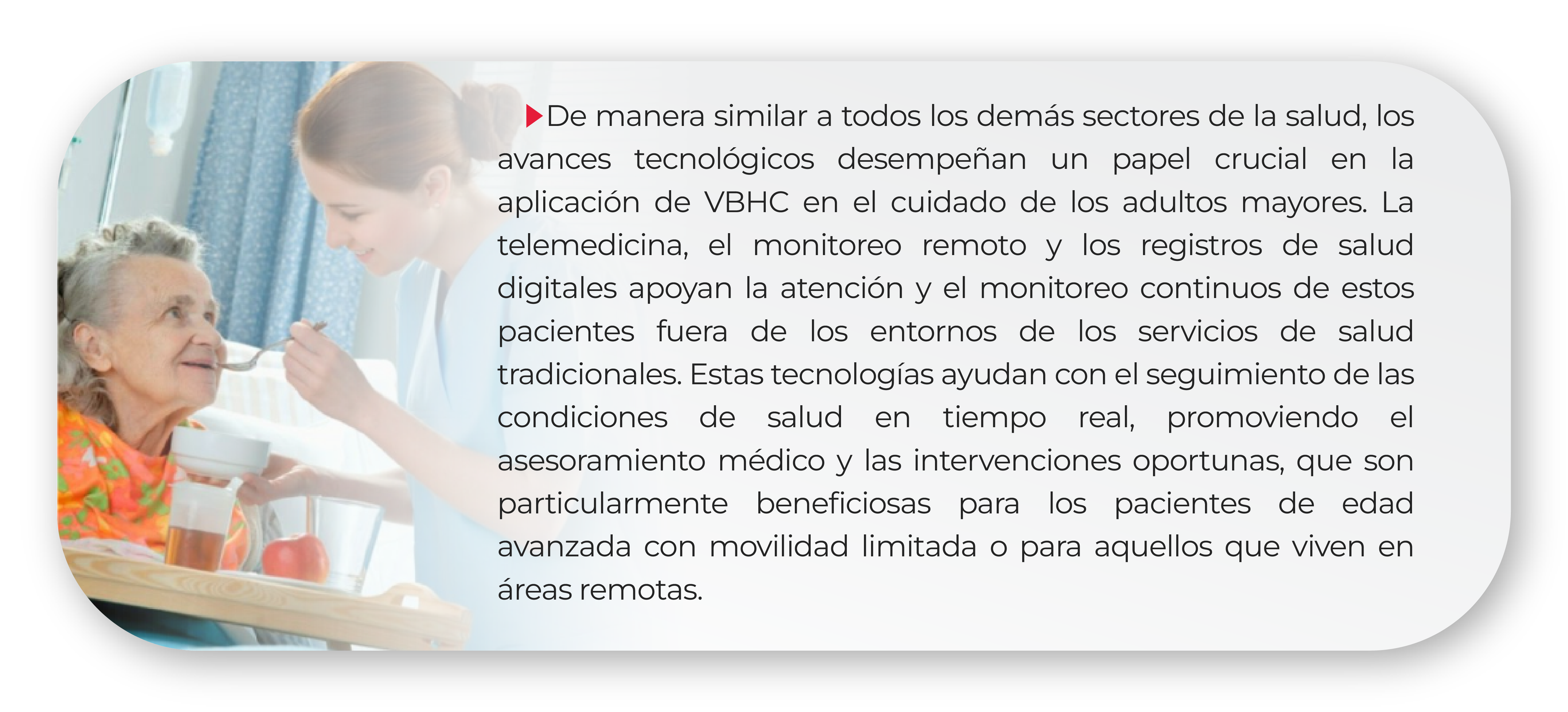 Uno de los impactos más significativos de VBHC en el cuidado de las personas de edad avanzada es el énfasis en los esfuerzos en mejorar la calidad de vida y la experiencia mientras reciben el tratamiento. Esto, contrario a los modelos tradicionales que, a menudo se centran en el tratamiento agudo sin a veces considerar el bienestar del paciente a largo plazo. VBHC incentiva a los proveedores a considerar cómo los tratamientos pueden impactar y mejorar la vida diaria, la movilidad y la independencia de los pacientes de edad avanzada. Los programas pueden incluir evaluaciones geriátricas integrales, planes de atención personalizados y seguimientos regulares, todos diseñados para mantener o mejorar el estado funcional y el bienestar.