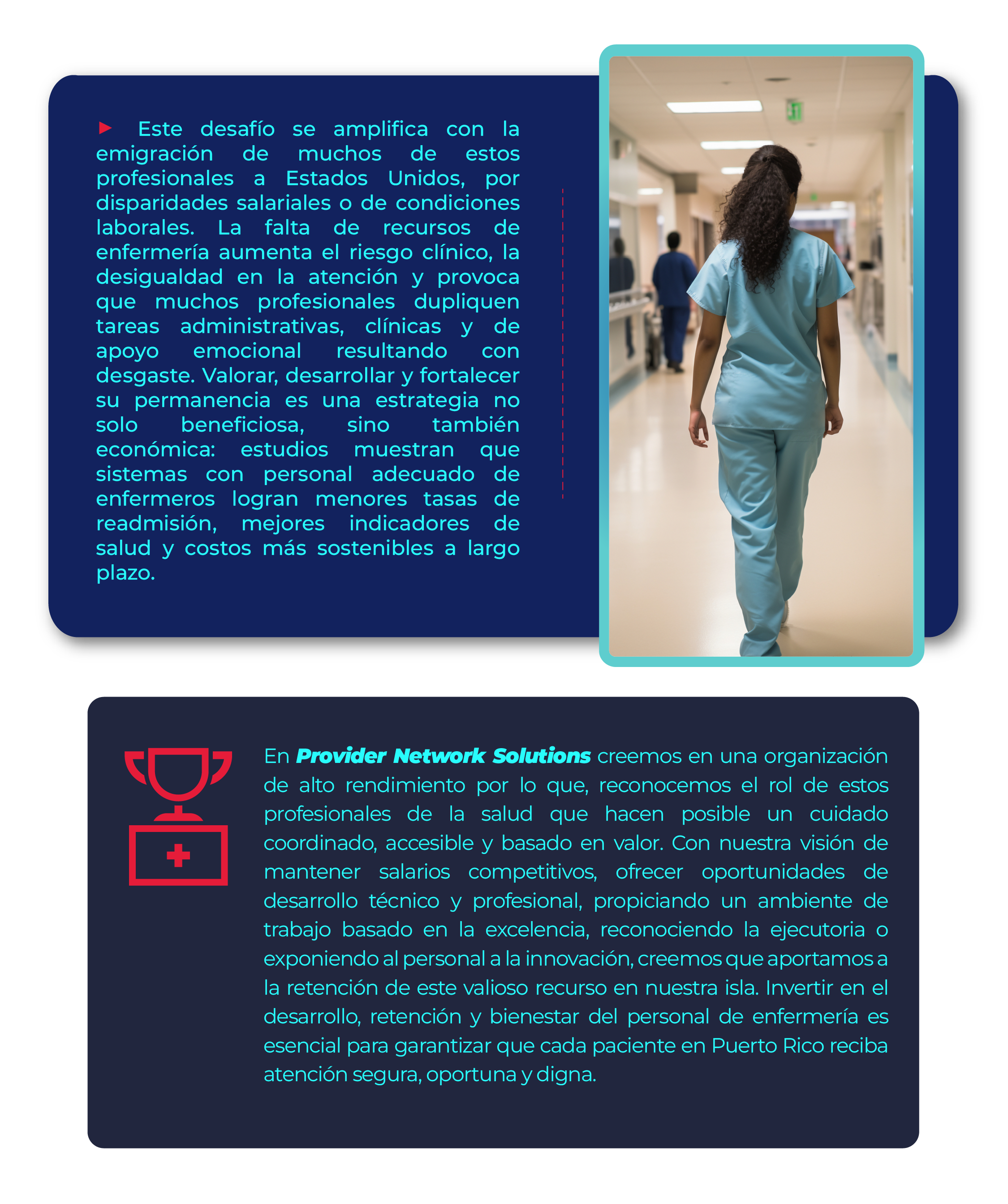 ▶ En un contexto de creciente prevalencia de enfermedades crónicas, envejecimiento poblacional (con más del 21 % de los residentes mayores de 65 años, según el Censo 2020) y aumento en la demanda de servicios domiciliarios y comunitarios, el rol del personal de enfermería se ha ampliado significativamente. En Puerto Rico, estos profesionales no solo administran tratamientos, sino que lideran intervenciones educativas, detectan complicaciones tempranas, coordinan equipos interdisciplinarios y ofrecen un acompañamiento emocional clave para pacientes y familias. Su preparación académica, cada vez más orientada a grados avanzados, les permite ejercer con criterio clínico en escenarios complejos, y en algunos casos, incluso cubrir vacíos en atención primaria, especialmente en comunidades rurales.