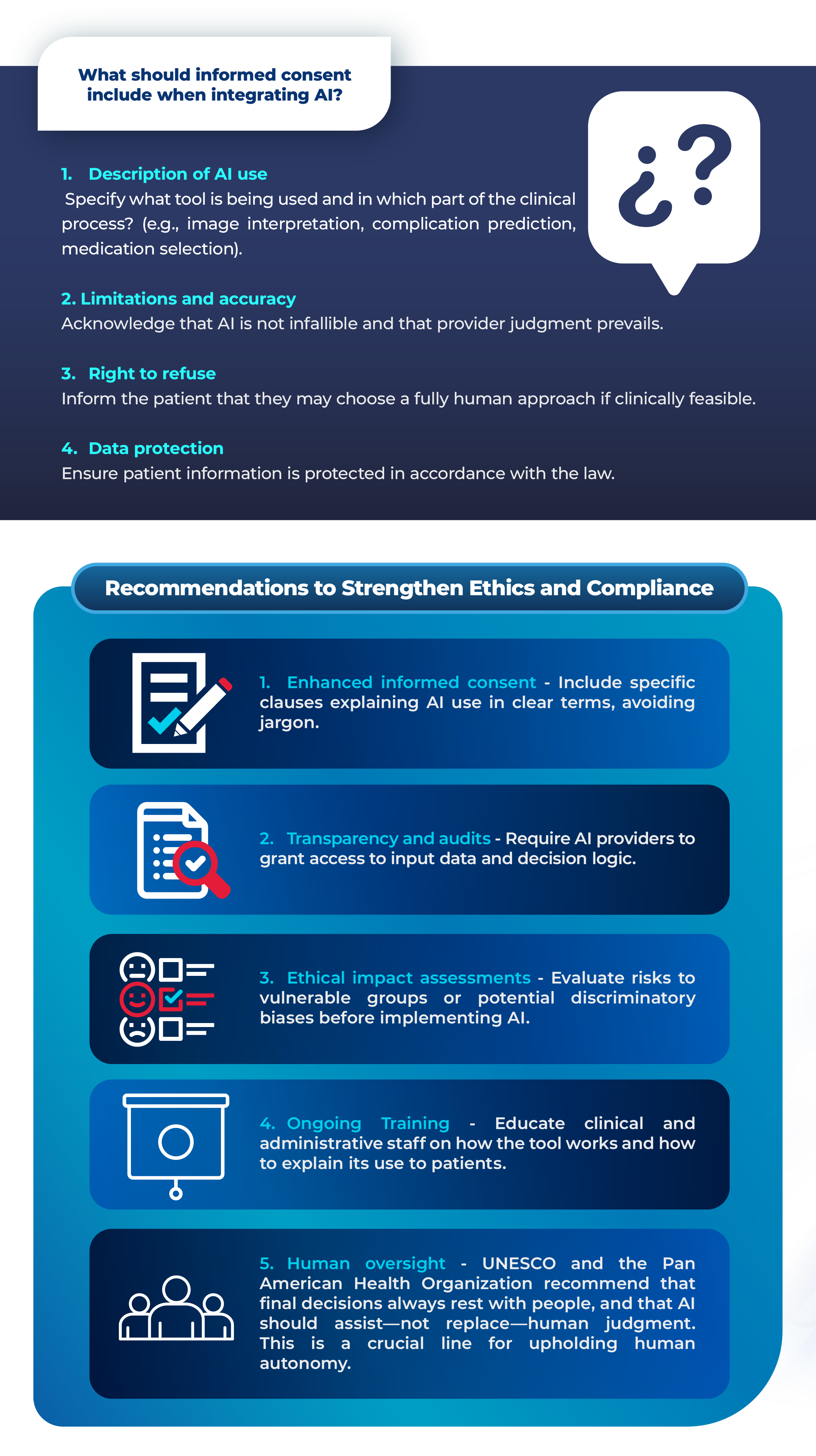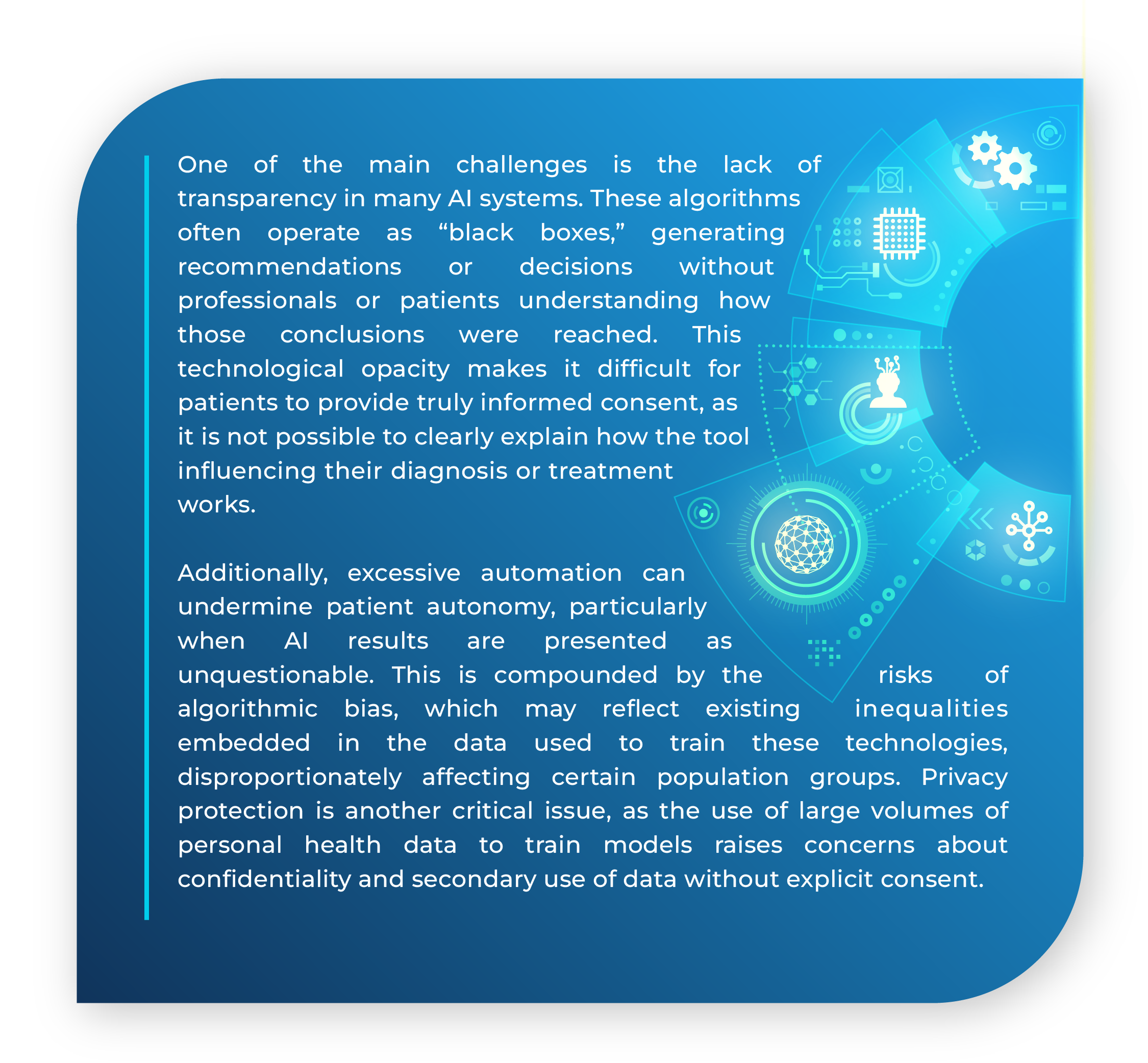 To address these challenges, it is essential to require that AI systems be auditable and capable of producing understandable explanations for both users and professionals. Informed consent processes must be redesigned using clear language, avoiding technical jargon, and supported by educational materials that facilitate patient understanding. Institutions should implement ethical impact assessments to evaluate risks before integrating AI into their services, fostering a culture of accountability. Likewise, digital education for both professionals and patients is vital to support informed and conscious decision-making in increasingly automated environments.