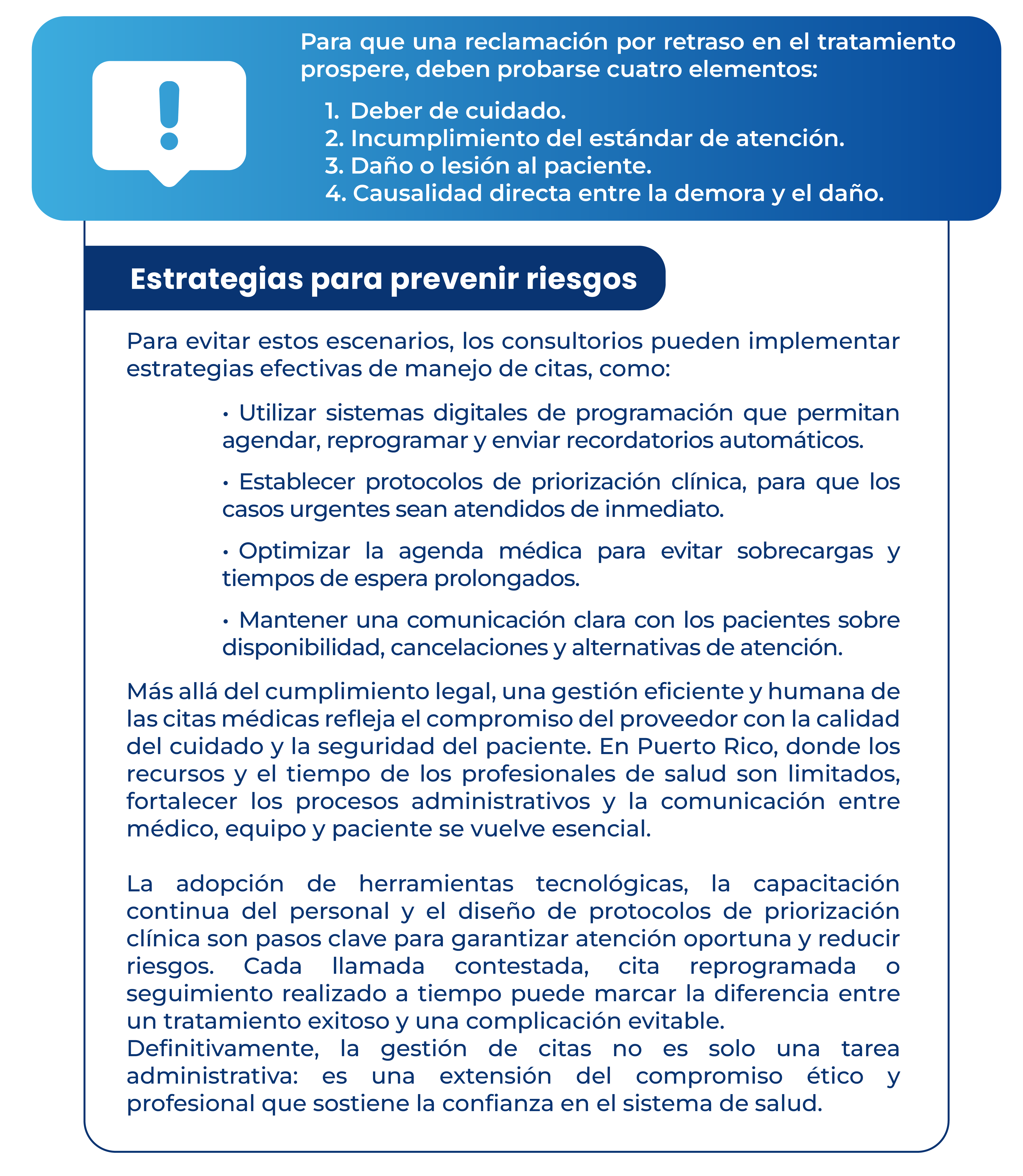 La gestión adecuada de las citas médicas es un elemento esencial para garantizar la calidad del servicio y la seguridad del paciente. Diversos estudios en Estados Unidos han demostrado que los retrasos en el acceso a la atención pueden tener consecuencias clínicas y legales significativas, un escenario que también resuena en Puerto Rico, donde los retos de disponibilidad y seguimiento oportuno son una realidad compartida por muchos proveedores. Implementar procesos organizados, mantener una comunicación efectiva con los pacientes y documentar las decisiones clínicas relacionadas con la programación son prácticas que fortalecen la confianza, previenen riesgos y promueven la continuidad del cuidado.