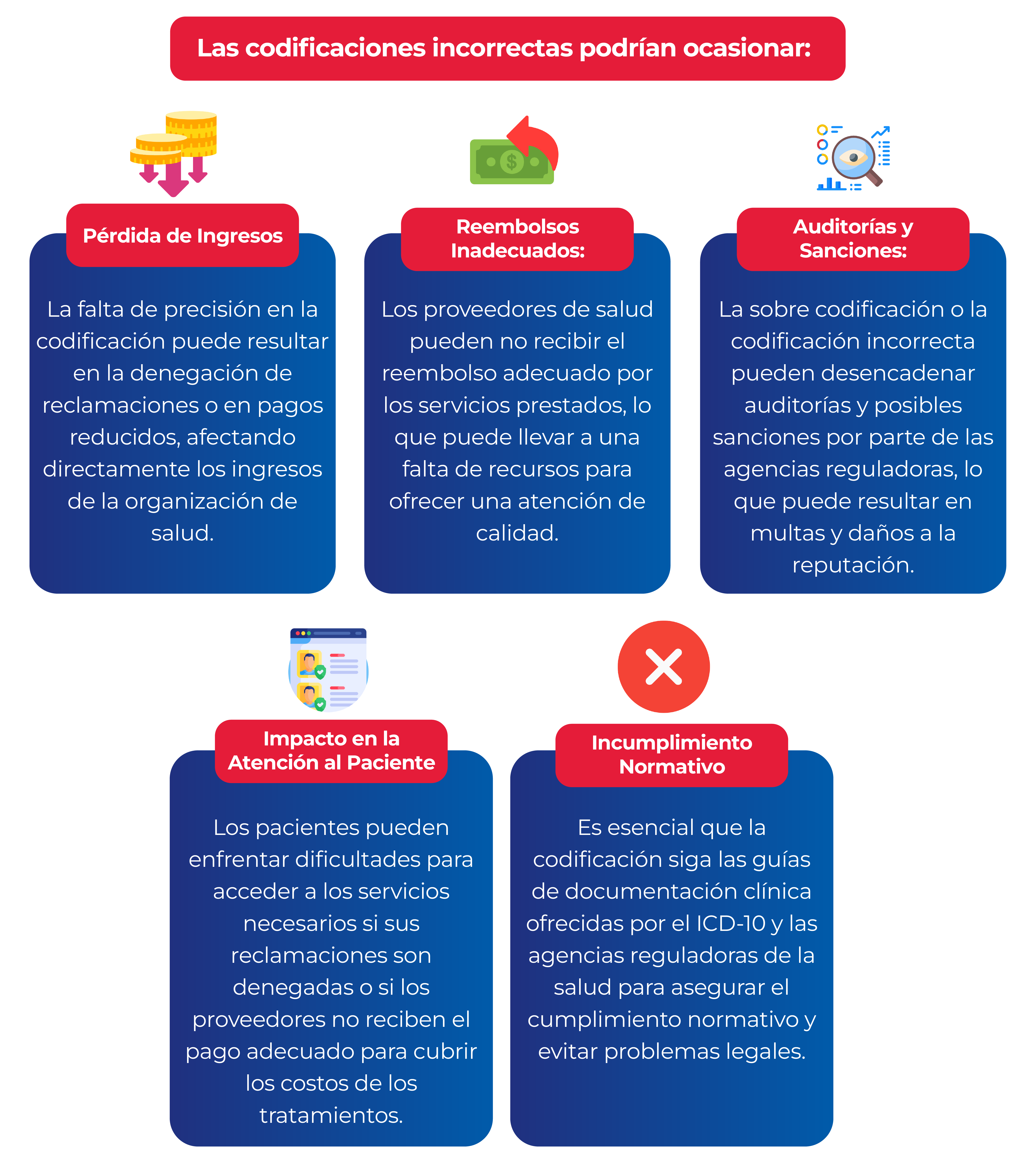 Para lograr una codificación adecuada es necesario que los proveedores de salud documenten y sustenten cada diagnóstico, siguiendo las guías de documentación clínica ofrecidas por el ICD-10 (International Classification of Diseases, 10th Revision) y las agencias reguladoras de la salud.