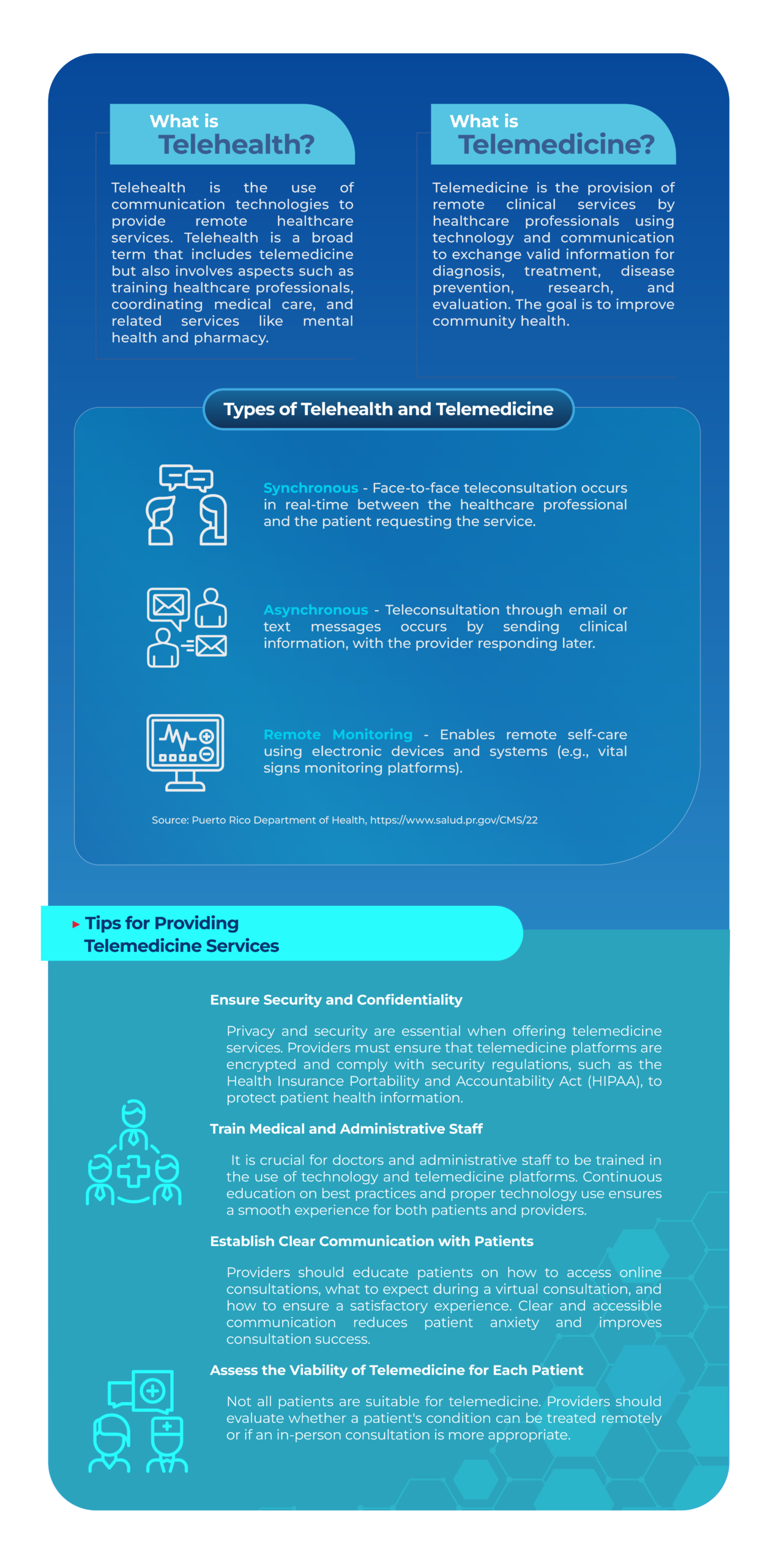 Telemedicine has emerged as an essential tool for improving access to healthcare, especially in a context where distance and lack of access to traditional health services represent significant barriers. Although in Puerto Rico, telehealth has gained prominence in recent years, becoming an innovative modality for healthcare providers, there is still a need to expand services.