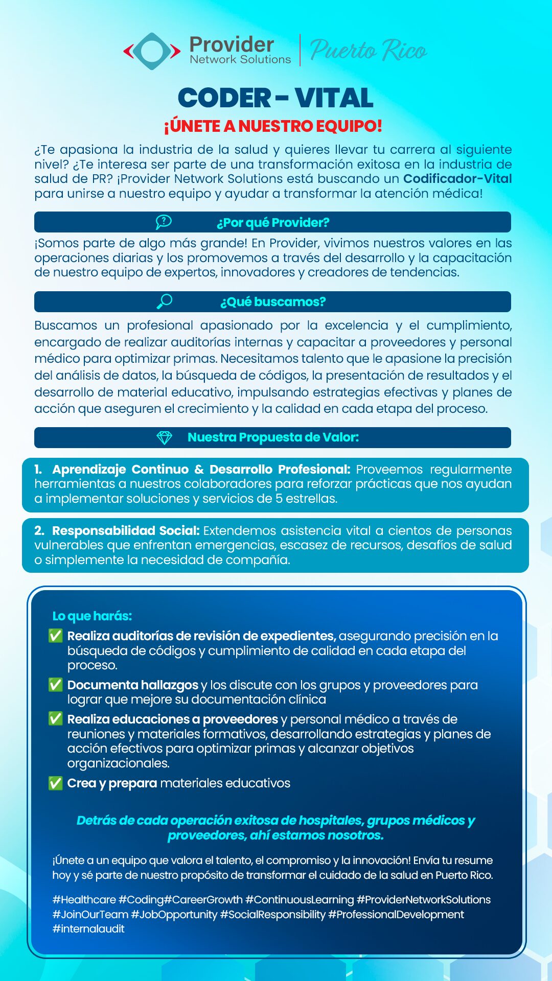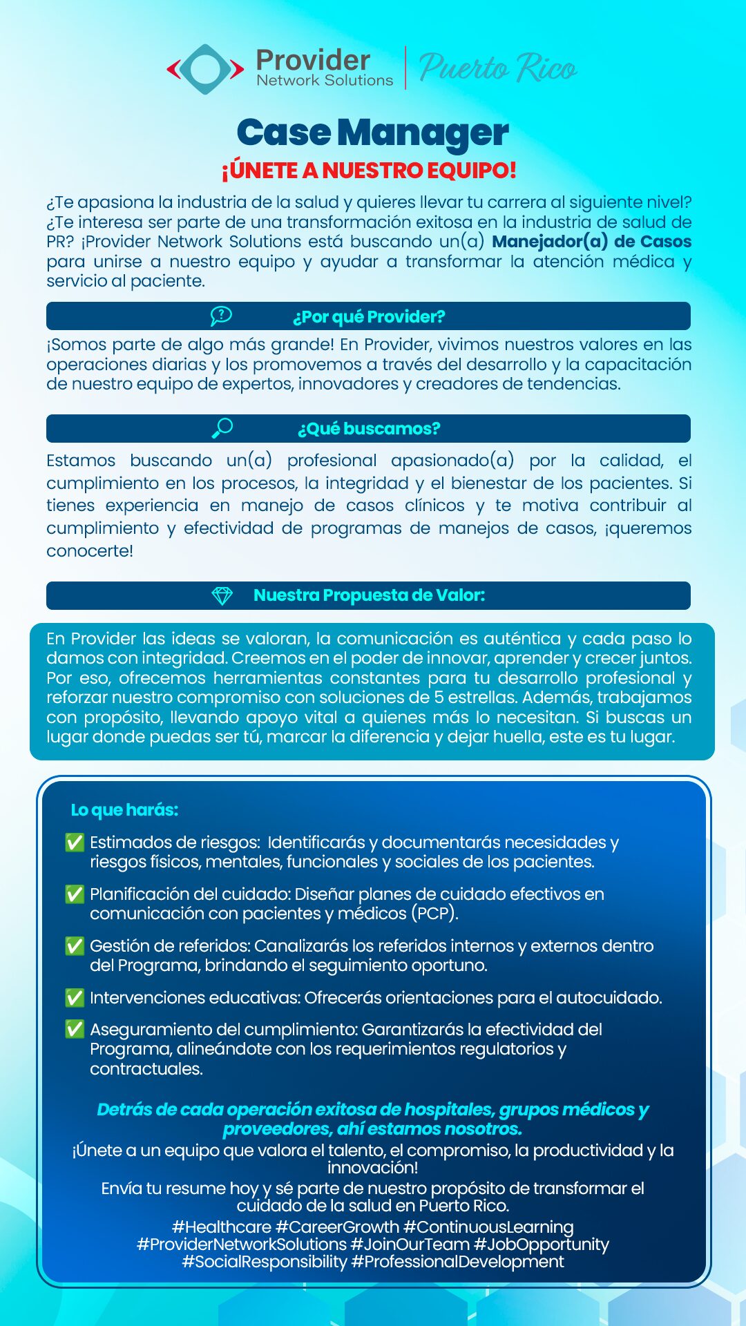 En Provider vivimos nuestros valores en las operaciones diarias y los promovemos a través del desarrollo y capacitación de nuestro equipo de expertos, innovadores y creadores de tendencias. Nosotros nos encargamos de formar a los líderes que hacen que las cosas sucedan en el ecosistema de salud.